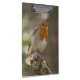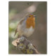 Um pisco de peito vermelho europeu (rubecula do Erithacus) que está em um ramo de árvore quebrado coberto nos líquenes.