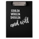 Envolva a motivação e a determinação com esta ousada design de prancheta que diz, "Podia, Woulda, Shoulda e Will." O fundo negro minimalista com um texto branco contrastante chama a atenção, fazer-o uma ferramenta perfeita para se manter organizado e inspirado ao longo do dia. Ideal para estudantes, profissionais e qualquer pessoa com uma atitude de fazer, esta área de transferência é mais do que um simples item funcional — é um lembrete para agir e atingir metas. Seja para trabalho, escola, ou casa, é o companheiro perfeito para aqueles que estão prontos para fazer as coisas acontecerem.