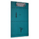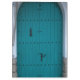 Porta da praia espanhola, azul-pesada, do Mediterrâneo, com dobradiças e travas de ferro em forma de cruz negra.