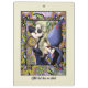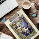 Fada de fada loira vestida roxa e vermelha num padrão geométrico floral, cor de laranja, lavanda e rosa.