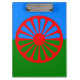 Bandeira oficial romanichel viajante de verde e azul que representa a terra e o céu com uma roda vermelha, representando viagem.