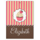 Design bonito do cupcake com opção do nome feito sob encomenda. O cupcake próprio tem polvilha e morango nele. O resto do design está em cores cor-de-rosa, bege e marrons.