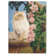 Um gato persa de cor creme com rosas rosa sujas enrolando a parede ao lado do gato. Perto é uma bela e verde seca do Senhor Celta