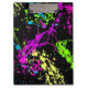 Fundo preto com um design retro do splatter da pintura dos anos 80 80s nas cores de néon do rosa quente, do roxo, do verde limão, do amarelo e do azul. Uma explosão do passado. Cores de néon vibrantes, brilhantes do quadril, as frescas e as impressionantes de cor-de-rosa, de verde, de azul, e o amarelo contra um fundo preto de alto contraste. Excelente para um presente retro do tema dos anos 80 80s para a menina ou a cara adolescente do artista. Trabalhos de arte do expressionism abstrato em um fulgor brilhante super no esquema de cores escuro do blacklight.