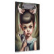 Perdido num mundo de imaginação e amor. Uma jovem está segurando um veado em seus braços. A garota está vestindo um vestido azul e tem um par de chifres na cabeça. A cena está em uma floresta, com árvores ao redor da menina e do veado
