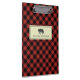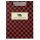 Uma prancheta com ilustração de um urso preto com design de xadrez de búfalos vermelho e preto. Personalize o texto.