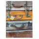 Velhas malas da década de 1940 empilhadas na plataforma da estação ferroviária, prontas para serem coletadas pelos proprietários. Inglaterra Reino Unido.