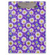 Um padrão ininterrupto colorido com margaridas com centros amarelos, folhas azuis e um fundo roxo vívido. Perfeito para temas de primavera, designs têxteis e artesanatos digitais ou impressão alegres.