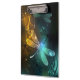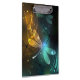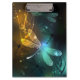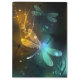 Voo de libélula brilhante, verde, desenhada artisticamente, com asas verdes e amarelas transparentes sobre fundo noturno brilhante com plantas pântanas e vagalumes. Dragonfly brilhante.
