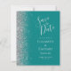 A borda esquerda deste elegante casamento moderno salve o cartão de data apresenta uma borda cintilante. O texto personalizável combina a escrita manual de cinzas prateadas, fontes copperplate e itálico em um fundo azul lacrimogêneo. O verso apresenta um cabo e design prateado correspondentes.