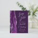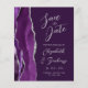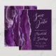 A borda esquerda deste elegante casamento moderno salve o cartão de data apresenta uma coloração d'água roxa com borda fina de prata. O texto personalizável combina a escrita manual de cinzas prateadas, fontes copperplate e itálico em um fundo de ameixa. O verso apresenta um design de agata prateado e roxo correspondente.