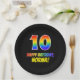 Este design de placa de papel colorida, divertida e alegre, tema de aniversário, apresenta um grande número "10" e a mensagem "FELIZ ANIVERSÁRIO", ambos tendo um gradiente de padrão inspirado no espectro do arco-íris, juntamente com um nome ousado e amarelo editável. O fundo é preto colorido. Diversão e personalização de pratos de papel temáticos de aniversário como este podem ser usados na celebração do décimo aniversário de alguém. [~Z0000488]