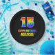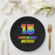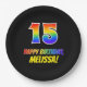 Este design de placa de papel colorida, alegre e divertida, com tema de aniversário, apresenta um grande número de "15" e a mensagem "FELIZ ANIVERSÁRIO", ambos coloridos com um padrão inspirado no gradiente do espectro do arco-íris, juntamente com um nome ousado e amarelo personalizável. Tem um fundo de cor preta. Diversão, personalizável pratos de papel temáticos de aniversário como este podem ser usados na festa de aniversário de alguém. [~Z0000488]