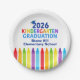These cute 2026 kindergarten graduation party plates feature a cool grad cap above colorful writing and a row of crayons in rainbow. Fun kindergartner graduate party decor in fun colors for the last day of elementary school. Congratulations to our kinder graduate!