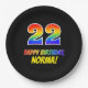 Este alegre, divertido e colorido design de placa de papel temático de aniversário apresenta um grande número "22" e a mensagem "FELIZ ANIVERSÁRIO", ambos coloridos com um padrão inspirado no gradiente do espectro do arco-íris, junto com um nome ousado e amarelo personalizável. Tem um fundo de cor preta. Placas de papel divertidas e personalizadas como esta podem ser usadas em uma festa de aniversário sendo realizada para celebrar o 22º aniversário de alguém. [~Z0000488]