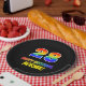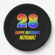 Este design de folha de papel de aniversário divertido, colorido e alegre apresenta um grande número "28" e a mensagem "FELIZ ANIVERSÁRIO", ambos coloridos com um padrão inspirado no gradiente do espectro do arco-íris, junto com um nome personalizado amarelo ousado. Tem um fundo de cor preta. Pratos de papel com tema de aniversário como este podem ser divertidos de ser usados em uma celebração sendo realizada para homenagear alguém que está comemorando seu 28º aniversário. [~Z0000488]