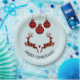 Chapas de papel que dizem "Feliz Natal" em texto curvo. Projetado com uma ilustração de 2 cervos de Natal saltando. Os cervejeiros são feitos de xadrez vermelha e preta, com um pouco de coração entre eles. As decorações de natal de xadrez vermelha e preta penduram no topo. Fundo azul claro.
