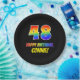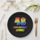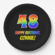Este alegre, divertido e colorido design de papel de aniversário apresenta um grande número "48" e a mensagem "FELIZ ANIVERSÁRIO", ambos coloridos com um padrão inspirado no gradiente do espectro do arco-íris, junto com um nome ousado e amarelo editável. Tem um fundo de cor preta. Diversão e personalização de pratos de papel temáticos de aniversário como este podem ser usados na celebração de 48 anos de alguém. [~Z0000488]