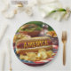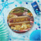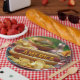 Um cachorro quente com a palavra "AMÉRICA" escrita na mostarda é colocado em uma placa de bandeira patriótica ao lado de uma pilha de batatas fritas