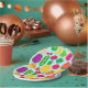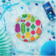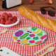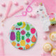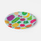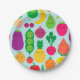 Um teste padrão da fruta e de vegetais coloridos felizes em um fundo azul, incluindo um pêssego, uma banana, um abacaxi, uma melancia, uma pera, umas cerejas, um rabanete, uma beringela (beringela), uma couve de Bruxelas, umas ervilhas, um rabanete e uma pimenta vermelha (pimenta de sino).