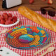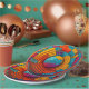 Colorful geometric shapes cover this 9" round paper plate. This unique design will add color and vibrancy to your party decor!