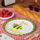 É primavera quando as abelhas começam a sair. Vestir sua mesa de pátio ou mesas de piquenique com listras amarelas bonitas e sorridentes abelhão batendo suas asas em papel. O fundo é branco claro. O caimento da borda é traçado em preto com pontos pretos contra fundo amarelo. Trabalho de arte de Gráfico Original © TamiraZDesign. www.zazzle.com/tamirazdesigns