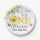 Mel Floral Abelha Primeiro Aniversário do Primeiro Aniversário Papel Plata Aroma Aroma Doce ou Abelhas de mel O primeiro prato de festa de aniversário para uma menina com arranjos florais majoritariamente amarelos e quatro adoráveis abelhinhas. Excelente para uma primeira festa de aniversário temática de abelhas.