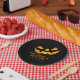 Coma beba & seja assustador com rosto de abóbora assustador em pratos de papel preto.