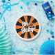 Placas de chá de fraldas para um chá de fraldas de Halloween com Oh baby! gravadas contra um impressão de explosão solar em preto e laranja com uma borda branca, num roteiro retrô, ao lado de uma abóbora feliz.