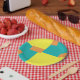 Um abstrato geométrico original em amarelo-limão, turquesa e laranja. NB Esse design também pode ser feito menor e usado como padrão em camadas.