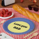 Um legal design de ponto grande amarelo e roxo em cores de tendência com um modelo de texto. Clique em personalizar para alterar as palavras curtas para seu gosto ou comprar-as como estão.