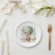 "Adventure Awaits" themed baby shower paper plates with an adorable fox holding a teddy bear riding in a green hot air balloon. The watercolor green sky has white clouds with surrounding gold stars. Template included.