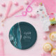 These elegant modern wedding plates feature a teal watercolor design trimmed with faux silver glitter. Easily customize the silver gray text on a dark teal background, with the names of the bride and groom in handwriting calligraphy over a large ampersand.