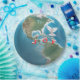 Pomba branca com cordas listradas vermelhas e brancas e texto da JOY natalícia num globo mundial.