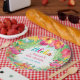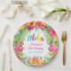 Este divertido aniversário Aloha luau prato apresenta flores tropicais brilhantes, flamingos e suas informações.  Os suprimentos da festa estão disponíveis na minha loja. Design ©Rosalind Moore, Design de Cherry Lane