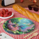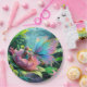 Uma menina e uma borboleta com asas iridescentes tocadas numa flor gigante numa selva exuberante, acompanhadas por um tucano colorido. Folhas grandes e flores vibrantes as cercam, criando uma cena mágica e caprichosa. Digital Art Photoshop CS6