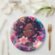 Bonito pratos de papel de aniversário de uma garota personalizada. Gráficos bonitos de uma linda moça de anime afro-americana com flores rosa bonito em seu lindo cabelo encaracolado. Estas são bonitas para uma adolescente ou pré-adolescente. As cores são cor-de-rosa, roxa, azul e amarela.