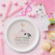 Este prato de aniversário da menina "oink, moo, cock-a-doodle do", bonitinho e moderno, apresenta um porco, galinha e vaca com um celeiro cor-de-rosa sobre um fundo cor-de-rosa esbranquiçado enquadrado por uma fronteira branca. Personalize para suas necessidades. Você pode encontrar produtos correspondentes na minha loja.
