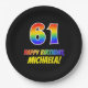 Esta design de placa de papel divertida, colorida e alegre, com tema de aniversário, apresenta um grande número "61" e a mensagem "FELIZ ANIVERSÁRIO", ambas coloridas com um padrão inspirado no gradiente do espectro do arco-íris, juntamente com um nome ousado e amarelo editável. Tem um fundo de cor preta. Placas de papel divertidas e editáveis como esta podem ser usadas em uma celebração sendo realizada para honrar o sessenta e primeiro aniversário de alguém. [~Z0000488]