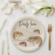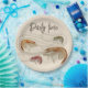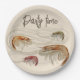 Pratos de papel para festa de frutos do mar com desenho de camarão e texto personalizado no topo. Use para celebrações de aniversário, reuniões de verão ou churrascos anuais na praia. As cores e o texto são unissex e os pratos vêm em dois tamanhos.