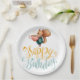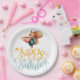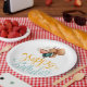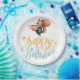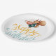 A ilustração de aquarela branca apresenta um adorável esquilo em macacões bebendo uma xícara de café ou chá quente. Texto "Parabéns" na fonte do script de duas cores do rico.