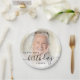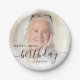 Placas de papel de festa de aniversário moderna com uma foto personalizada. Substitua facilmente a imagem de exemplo por uma foto do convidado de honra. A palavra "aniversário" aparece no elegante roteiro preto de manuscrito. Personalize o texto com o nome e o ano de aniversário na fonte de sans serif negra. Uma camada branca de gradiente ajuda a tornar o texto pop.