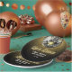 Bola de disco prateada e espelhada metálica com placas de papel de aniversários de festa de efeito de meio tom dourado.