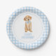 Aniversário do recuperador do ouro de filhotes de pré-disquete com arco azul e xadrez azul.