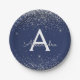 Pratos de festa de aniversário ou despedida de solteira elegantes em azul marinho e prata com brilho e glitter falso. Estes pratos de festa de casamento, despedida de solteira, chá de bebê, aniversário de casamento, chá de noiva ou Sweet 16, 1º, 13º, 15º, 16º, 18º, 21º, 30º, 40º, 50º, 60º, 70º, 80º, 90º, 100º aniversário podem ser personalizados para incluir seu inicial e primeiro nome. Por favor, entre em contato com o designer para itens combinando personalizados.