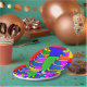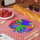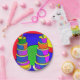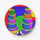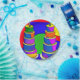 Placas de aniversário com um design colorido de bolo de arte Pop.