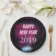 Usando um fundo preto, essas placas apresentam um display roxo brilhante com "Feliz ano novo" gravado em letras lilás grandes. O ano "2019" está escrito abaixo. Personalize este prato como quiser.