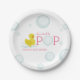 Placas de papel de chá de fraldas com ilustração de bolhas e um pato de borracha incorporado ao texto "Ela está prestes a POP" Personalize o nome.