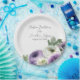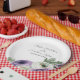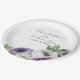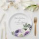 Esses pratos florais românticos apresentam um design simples e elegante em branco com flores de ranunculus roxas e brancas em aquarela. Um delicado buquê de ranunculus e folhagens é retratado no canto inferior direito. Nomes de amostra de um casal recém-casado e data de casamento são impressos na parte superior. Você pode personalizar os pratos para incluir seus próprios nomes ou texto personalizado.