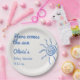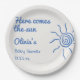 Prato De Papel Aqui Vem O Chá de fraldas Desenhado Da Mão Azul Do